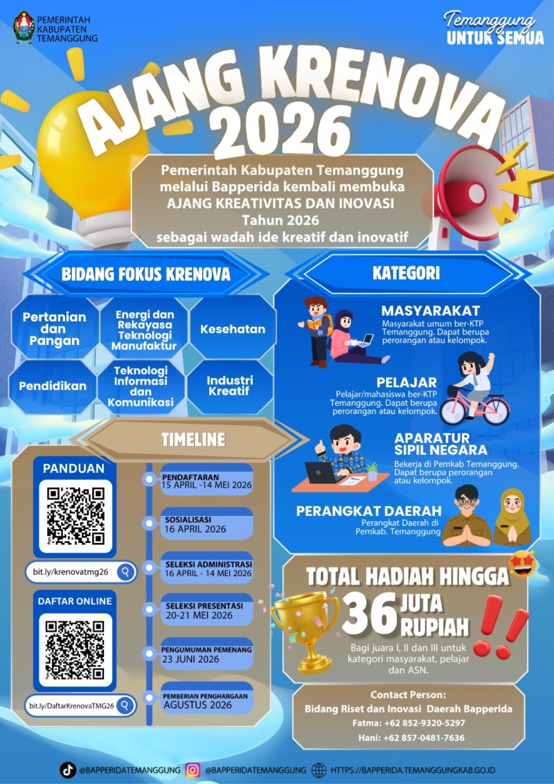 Kategori Lainnya Kategori: Smart Society (Masyarakat Cerdas) , Lainnya 13 April 2026 14:00:00 13 SEGERA DAFTARKAN INOVASI ANDA !!! DI LOMBA KREATIVITAS DAN INOVASI (KRENOVA) KABUPATEN TEMANGGUNG TAHUN 2026 Selengkapnya Kategori: Smart Government (Pemerintah Cerdas) , Lainnya 10 November 2025 10:46:00 17 Upacara Bendera Dalam Rangka Peringatan Hari Pahlawan dan Hari Jadi Kabupaten Temanggung Ke 191 Tahun Selengkapnya 123NextLast